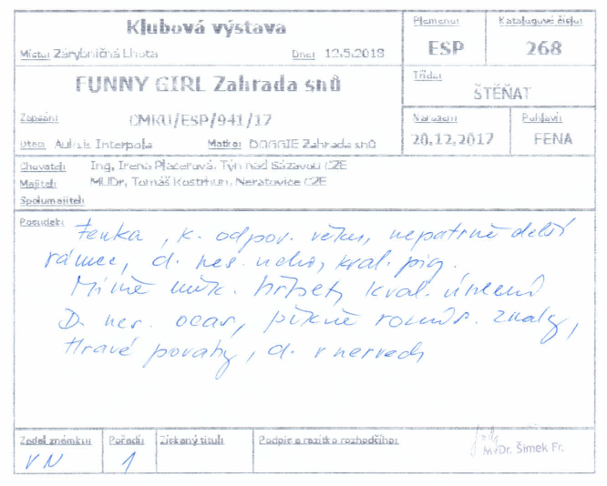 12.5.2018 Klubová výstava KŠSP Zárybničná Lhota: diplom, VN1